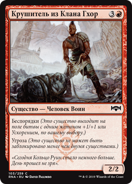| Rules | Riot (This creature enters the battlefield with your choice of a +1/+1 counter or haste.) Menace (This creature can't be blocked except by two or more creatures.) |