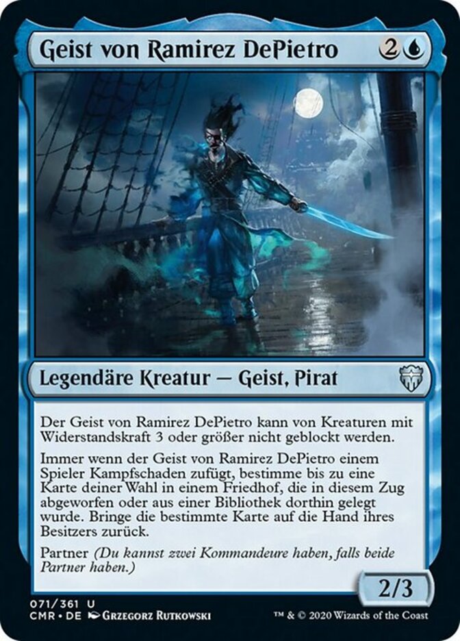 | Rules | Ghost of Ramirez DePietro can't be blocked by creatures with toughness 3 or greater. Whenever Ghost of Ramirez DePietro deals combat damage to a player, choose up to one target card in a graveyard that was discarded or put there from a library this turn. Put that card into its owner's hand. Partner (You can have two commanders if both have partner.) |