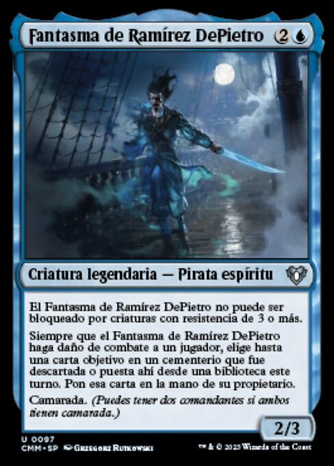 | Rules | Ghost of Ramirez DePietro can't be blocked by creatures with toughness 3 or greater. Whenever Ghost of Ramirez DePietro deals combat damage to a player, choose up to one target card in a graveyard that was discarded or put there from a library this turn. Put that card into its owner's hand. Partner (You can have two commanders if both have partner.) |