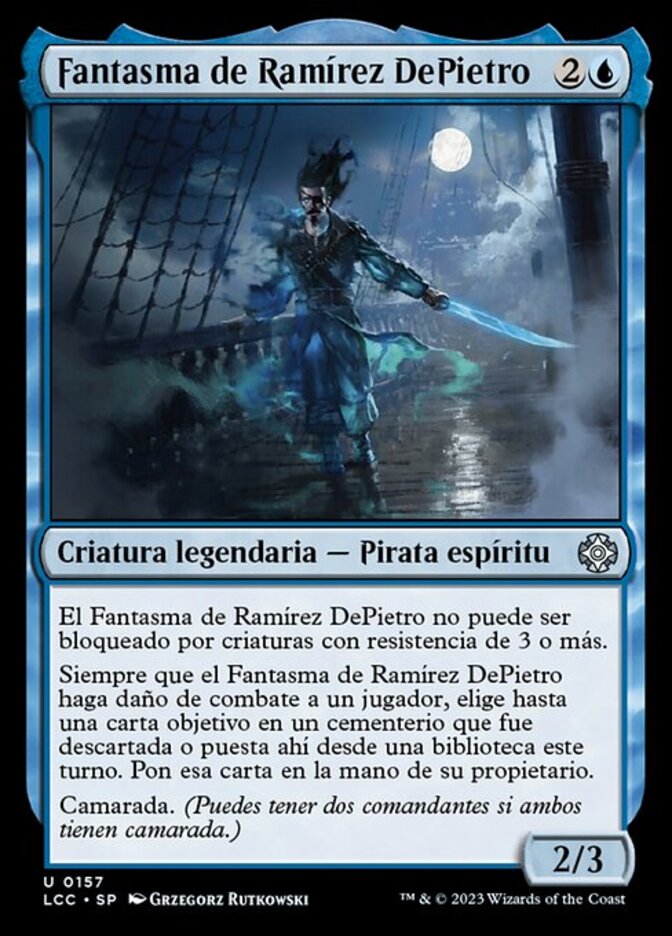 | Rules | Ghost of Ramirez DePietro can't be blocked by creatures with toughness 3 or greater. Whenever Ghost of Ramirez DePietro deals combat damage to a player, choose up to one target card in a graveyard that was discarded or put there from a library this turn. Put that card into its owner's hand. Partner (You can have two commanders if both have partner.) |