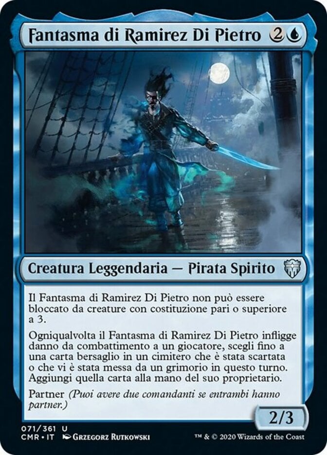 | Rules | Ghost of Ramirez DePietro can't be blocked by creatures with toughness 3 or greater. Whenever Ghost of Ramirez DePietro deals combat damage to a player, choose up to one target card in a graveyard that was discarded or put there from a library this turn. Put that card into its owner's hand. Partner (You can have two commanders if both have partner.) |