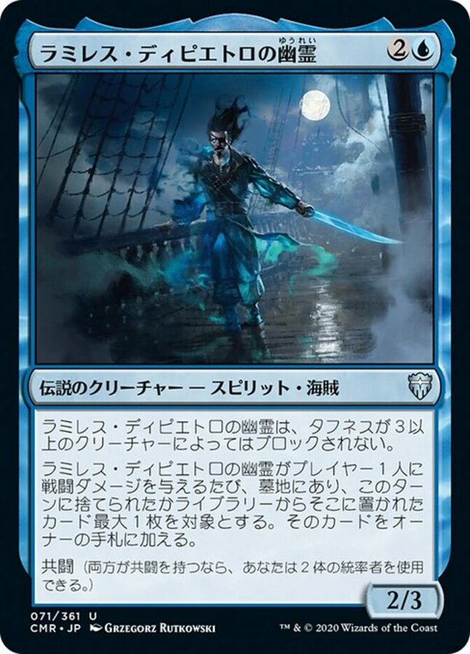 | Rules | Ghost of Ramirez DePietro can't be blocked by creatures with toughness 3 or greater. Whenever Ghost of Ramirez DePietro deals combat damage to a player, choose up to one target card in a graveyard that was discarded or put there from a library this turn. Put that card into its owner's hand. Partner (You can have two commanders if both have partner.) |