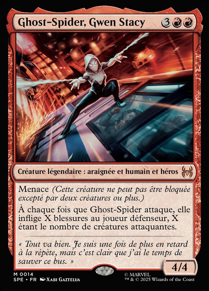 | Rules | Menace (This creature can't be blocked except by two or more creatures.) Whenever Ghost-Spider attacks, she deals X damage to defending player, where X is the number of attacking creatures. |