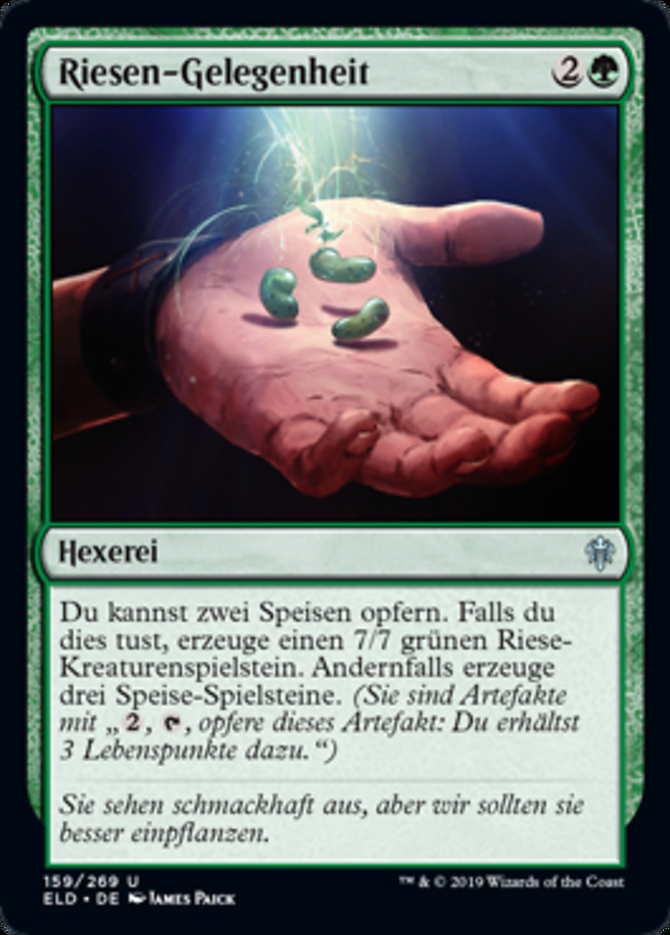 | Rules | You may sacrifice two Foods. If you do, create a 7/7 green Giant creature token. Otherwise, create three Food tokens. (They're artifacts with ", , Sacrifice this artifact: You gain 3 life.") |