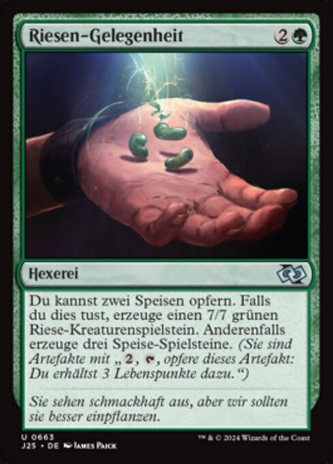 | Rules | You may sacrifice two Foods. If you do, create a 7/7 green Giant creature token. Otherwise, create three Food tokens. (They're artifacts with ", , Sacrifice this artifact: You gain 3 life.") |