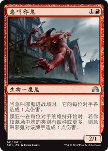 | Rules | When Gibbering Fiend enters the battlefield, it deals 1 damage to each opponent. Delirium — At the beginning of each opponent's upkeep, if there are four or more card types among cards in your graveyard, Gibbering Fiend deals 1 damage to that player. |