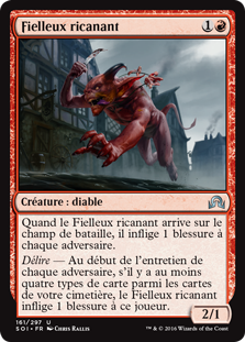| Rules | When Gibbering Fiend enters the battlefield, it deals 1 damage to each opponent. Delirium — At the beginning of each opponent's upkeep, if there are four or more card types among cards in your graveyard, Gibbering Fiend deals 1 damage to that player. |