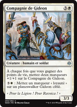 | Rules | Whenever you gain life, put two +1/+1 counters on Gideon's Company. : Put a loyalty counter on target Gideon planeswalker. |