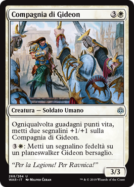 | Rules | Whenever you gain life, put two +1/+1 counters on Gideon's Company. : Put a loyalty counter on target Gideon planeswalker. |