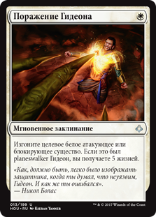 | Rules | Exile target white creature that's attacking or blocking. If it was a Gideon planeswalker, you gain 5 life. |