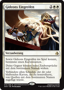 | Rules | As Gideon's Intervention enters the battlefield, choose a card name. Your opponents can't cast spells with the chosen name. Prevent all damage that would be dealt to you and permanents you control by sources with the chosen name. |