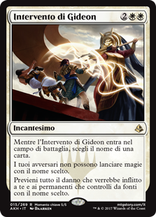 | Rules | As Gideon's Intervention enters the battlefield, choose a card name. Your opponents can't cast spells with the chosen name. Prevent all damage that would be dealt to you and permanents you control by sources with the chosen name. |