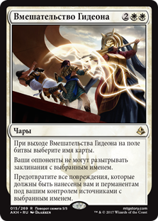 | Rules | As Gideon's Intervention enters the battlefield, choose a card name. Your opponents can't cast spells with the chosen name. Prevent all damage that would be dealt to you and permanents you control by sources with the chosen name. |