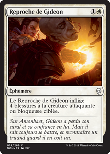 | Rules | Gideon's Reproach deals 4 damage to target attacking or blocking creature. |