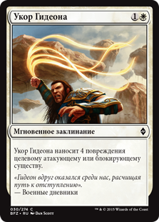 | Rules | Gideon's Reproach deals 4 damage to target attacking or blocking creature. |