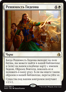 | Rules | When Gideon's Resolve enters the battlefield, you may search your library and/or graveyard for a card named Gideon, Martial Paragon, reveal it, and put it into your hand. If you search your library this way, shuffle. Creatures you control get +1/+1. |