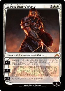 | Rules | +1: Put a loyalty counter on Gideon, Champion of Justice for each creature target opponent controls. 0: Until end of turn, Gideon, Champion of Justice becomes a Human Soldier creature with power and toughness each equal to the number of loyalty counters on him and gains indestructible. He's still a planeswalker. Prevent all damage that would be dealt to him this turn. −15: Exile all other permanents. |
