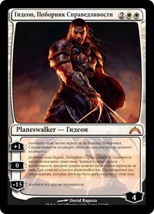 | Rules | +1: Put a loyalty counter on Gideon, Champion of Justice for each creature target opponent controls. 0: Until end of turn, Gideon, Champion of Justice becomes a Human Soldier creature with power and toughness each equal to the number of loyalty counters on him and gains indestructible. He's still a planeswalker. Prevent all damage that would be dealt to him this turn. −15: Exile all other permanents. |