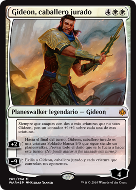 | Rules | Whenever you attack with two or more non-Gideon creatures, put a +1/+1 counter on each of those creatures. +2: Until end of turn, Gideon, the Oathsworn becomes a 5/5 white Soldier creature that's still a planeswalker. Prevent all damage that would be dealt to him this turn. (He can't attack if he was cast this turn.) −9: Exile Gideon, the Oathsworn and each creature your opponents control. |
