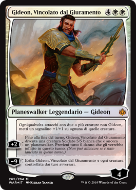| Rules | Whenever you attack with two or more non-Gideon creatures, put a +1/+1 counter on each of those creatures. +2: Until end of turn, Gideon, the Oathsworn becomes a 5/5 white Soldier creature that's still a planeswalker. Prevent all damage that would be dealt to him this turn. (He can't attack if he was cast this turn.) −9: Exile Gideon, the Oathsworn and each creature your opponents control. |