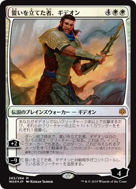 | Rules | Whenever you attack with two or more non-Gideon creatures, put a +1/+1 counter on each of those creatures. +2: Until end of turn, Gideon, the Oathsworn becomes a 5/5 white Soldier creature that's still a planeswalker. Prevent all damage that would be dealt to him this turn. (He can't attack if he was cast this turn.) −9: Exile Gideon, the Oathsworn and each creature your opponents control. |