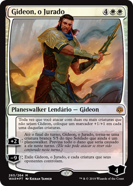 | Rules | Whenever you attack with two or more non-Gideon creatures, put a +1/+1 counter on each of those creatures. +2: Until end of turn, Gideon, the Oathsworn becomes a 5/5 white Soldier creature that's still a planeswalker. Prevent all damage that would be dealt to him this turn. (He can't attack if he was cast this turn.) −9: Exile Gideon, the Oathsworn and each creature your opponents control. |