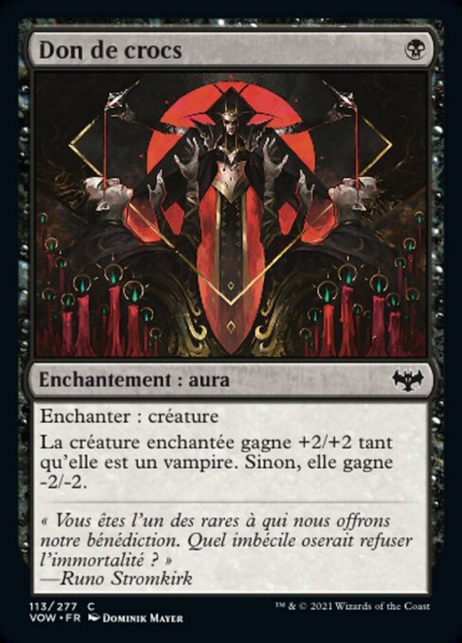 | Rules | Enchant creature Enchanted creature gets +2/+2 as long as it's a Vampire. Otherwise, it gets -2/-2. |