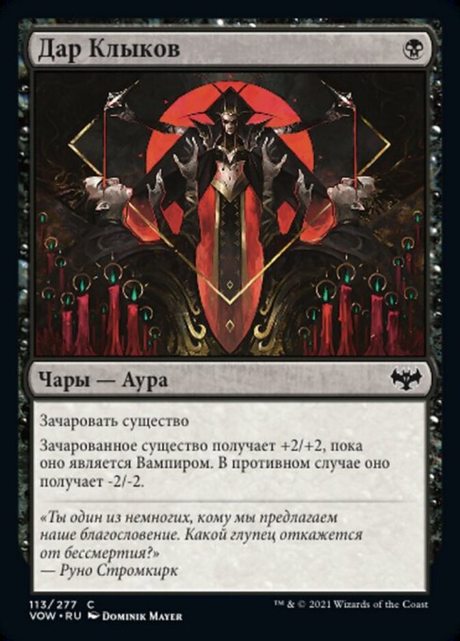 | Rules | Enchant creature Enchanted creature gets +2/+2 as long as it's a Vampire. Otherwise, it gets -2/-2. |