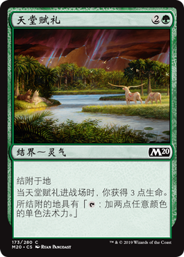 | Rules | Enchant land When Gift of Paradise enters the battlefield, you gain 3 life. Enchanted land has ": Add two mana of any one color." |