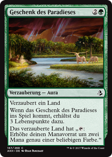 | Rules | Enchant land When Gift of Paradise enters the battlefield, you gain 3 life. Enchanted land has ": Add two mana of any one color." |