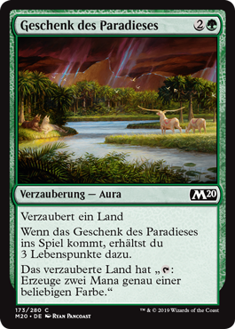 | Rules | Enchant land When Gift of Paradise enters the battlefield, you gain 3 life. Enchanted land has ": Add two mana of any one color." |