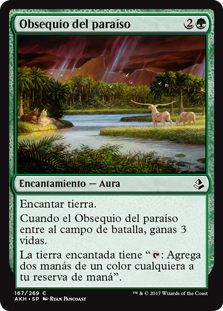 | Rules | Enchant land When Gift of Paradise enters the battlefield, you gain 3 life. Enchanted land has ": Add two mana of any one color." |