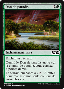 | Rules | Enchant land When Gift of Paradise enters the battlefield, you gain 3 life. Enchanted land has ": Add two mana of any one color." |