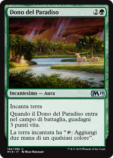 | Rules | Enchant land When Gift of Paradise enters the battlefield, you gain 3 life. Enchanted land has ": Add two mana of any one color." |