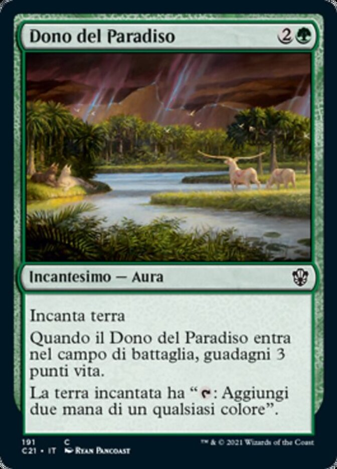 | Rules | Enchant land When Gift of Paradise enters the battlefield, you gain 3 life. Enchanted land has ": Add two mana of any one color." |