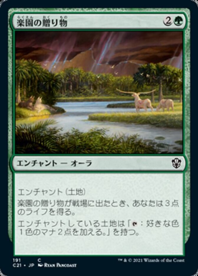 | Rules | Enchant land When Gift of Paradise enters the battlefield, you gain 3 life. Enchanted land has ": Add two mana of any one color." |