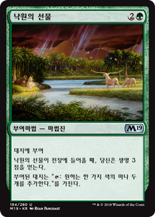 | Rules | Enchant land When Gift of Paradise enters the battlefield, you gain 3 life. Enchanted land has ": Add two mana of any one color." |
