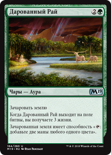 | Rules | Enchant land When Gift of Paradise enters the battlefield, you gain 3 life. Enchanted land has ": Add two mana of any one color." |