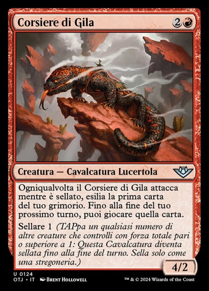| Rules | Whenever Gila Courser attacks while saddled, exile the top card of your library. Until the end of your next turn, you may play that card. Saddle 1 (Tap any number of other creatures you control with total power 1 or more: This Mount becomes saddled until end of turn. Saddle only as a sorcery.) |