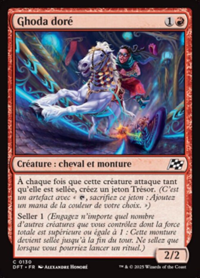 | Rules | Whenever this creature attacks while saddled, create a Treasure token. (It's an artifact with ", Sacrifice this token: Add one mana of any color.") Saddle 1 (Tap any number of other creatures you control with total power 1 or more: This Mount becomes saddled until end of turn. Saddle only as a sorcery.) |