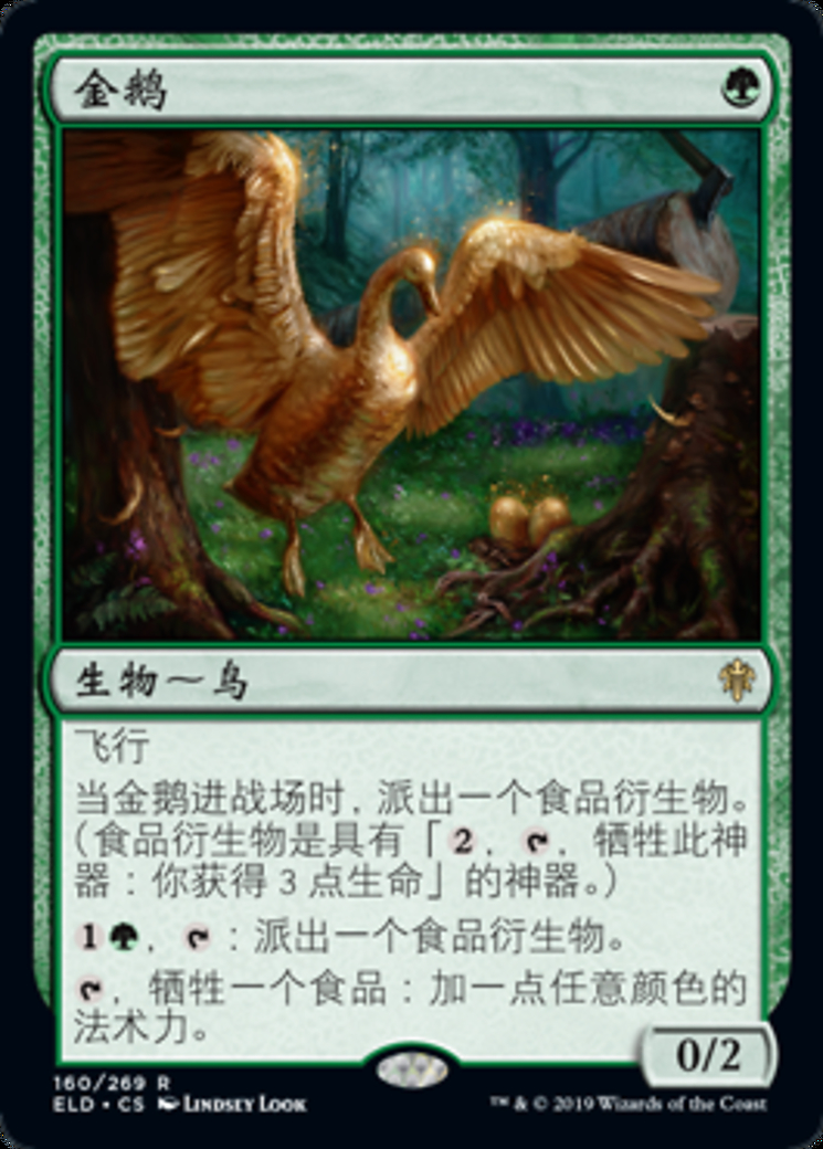 | Rules | Flying When Gilded Goose enters the battlefield, create a Food token. (It's an artifact with ", , Sacrifice this artifact: You gain 3 life.") , : Create a Food token. , Sacrifice a Food: Add one mana of any color. |