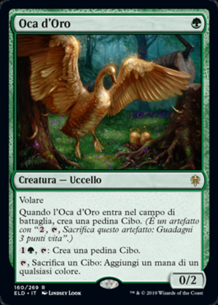 | Rules | Flying When Gilded Goose enters the battlefield, create a Food token. (It's an artifact with ", , Sacrifice this artifact: You gain 3 life.") , : Create a Food token. , Sacrifice a Food: Add one mana of any color. |