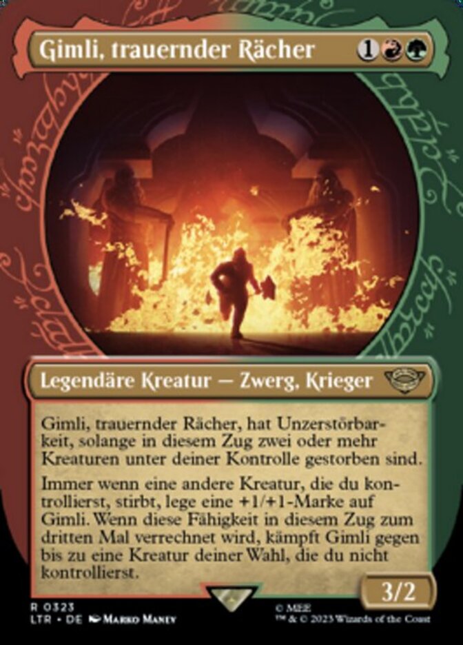 | Rules | Gimli, Mournful Avenger has indestructible as long as two or more creatures died under your control this turn. Whenever another creature you control dies, put a +1/+1 counter on Gimli. When this ability resolves for the third time this turn, Gimli fights up to one target creature you don't control. |