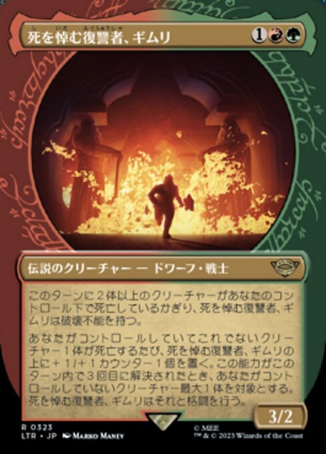 | Rules | Gimli, Mournful Avenger has indestructible as long as two or more creatures died under your control this turn. Whenever another creature you control dies, put a +1/+1 counter on Gimli. When this ability resolves for the third time this turn, Gimli fights up to one target creature you don't control. |
