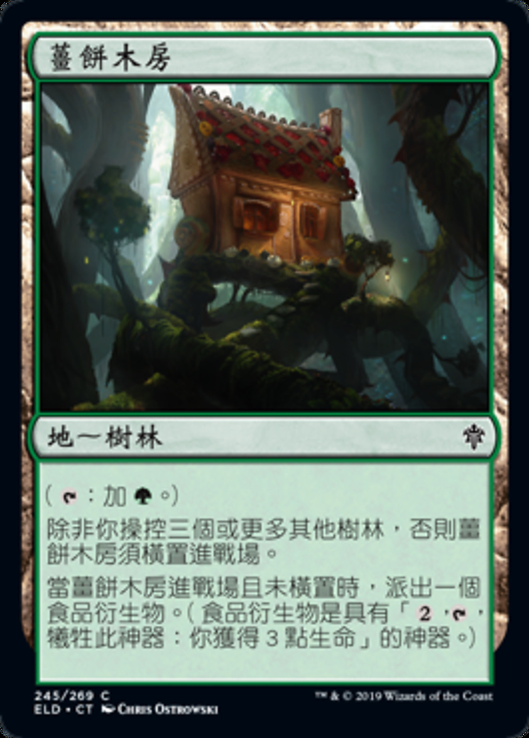 | Rules | (: Add .) Gingerbread Cabin enters the battlefield tapped unless you control three or more other Forests. When Gingerbread Cabin enters the battlefield untapped, create a Food token. (It's an artifact with ", , Sacrifice this artifact: You gain 3 life.") |
