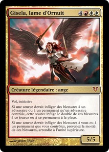 | Rules | Flying, first strike If a source would deal damage to an opponent or a permanent an opponent controls, that source deals double that damage to that player or permanent instead. If a source would deal damage to you or a permanent you control, prevent half that damage, rounded up. |