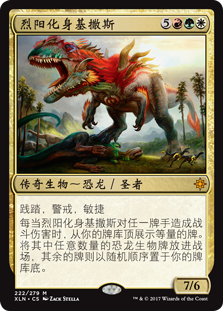 | Rules | Vigilance, trample, haste Whenever Gishath, Sun's Avatar deals combat damage to a player, reveal that many cards from the top of your library. Put any number of Dinosaur creature cards from among them onto the battlefield and the rest on the bottom of your library in a random order. |