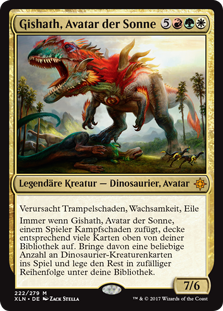 | Rules | Vigilance, trample, haste Whenever Gishath, Sun's Avatar deals combat damage to a player, reveal that many cards from the top of your library. Put any number of Dinosaur creature cards from among them onto the battlefield and the rest on the bottom of your library in a random order. |