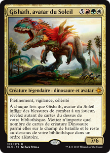 | Rules | Vigilance, trample, haste Whenever Gishath, Sun's Avatar deals combat damage to a player, reveal that many cards from the top of your library. Put any number of Dinosaur creature cards from among them onto the battlefield and the rest on the bottom of your library in a random order. |