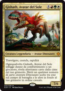 | Rules | Vigilance, trample, haste Whenever Gishath, Sun's Avatar deals combat damage to a player, reveal that many cards from the top of your library. Put any number of Dinosaur creature cards from among them onto the battlefield and the rest on the bottom of your library in a random order. |
